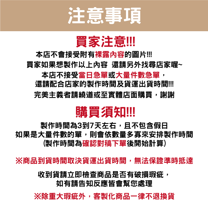 Step5:製作時間約3-5個工作天內,件數較多會依照單量去評估喔!